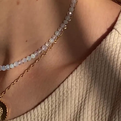 Unser traumhaft schimmernder Choker Victoria ist mit kleinen, mehrfach facettierten Perlen aus Opalith besetzt. Die Perlen schimmern im Licht leicht milchig – weshalb sie auch Opalith-Mondsteine genannt werden. Dem Opalith wird eine stressmilderne Wirkung nachgesagt, die zu mehr Ruhe und Ausgeglichenheit verhilft. Für uns aber das überzeugendste Argument sind die tausenden kleinen Regenbogen, die bei Lichteinfall durch die Facetten der Perlen entstehen.. Aber jetzt machen wir uns erst Mal auf die Suche nach dem Schatz, am Ende des Regenbogens.
